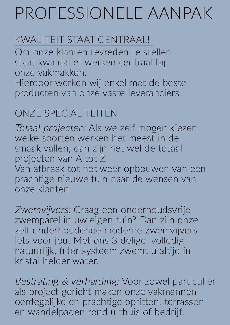 JTB Grondwerken & Tuinprojectenis een jonge en dynamische onderneming waar de belangen van de klant centraal staan! Hierdoor werken wij met een 5 daagse directe service en een vaste prijs garantie.